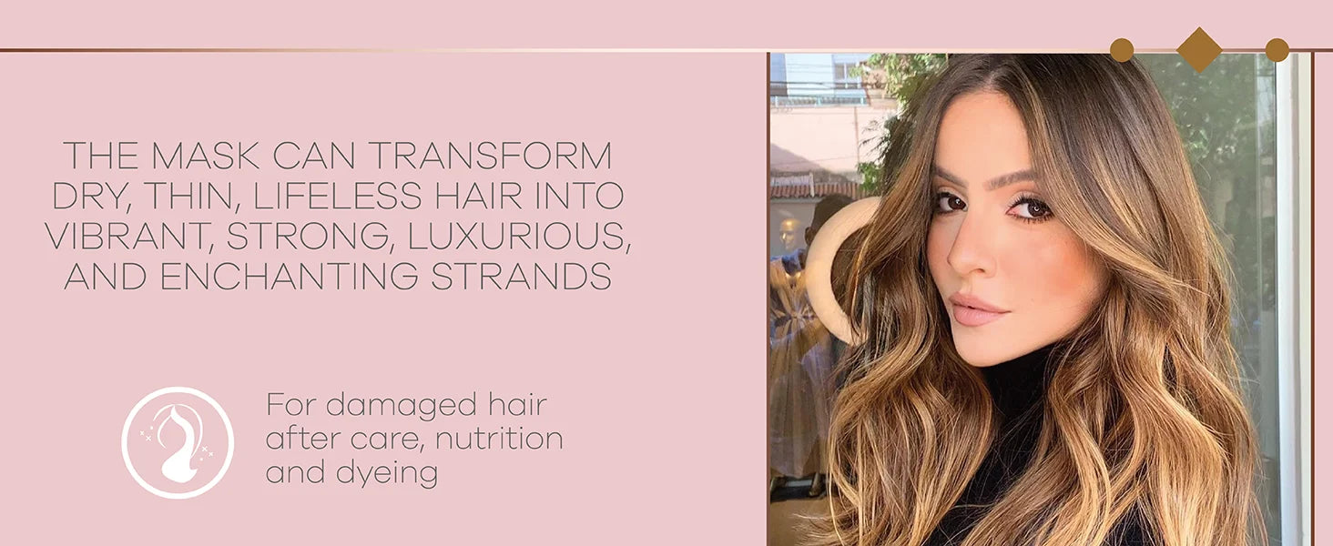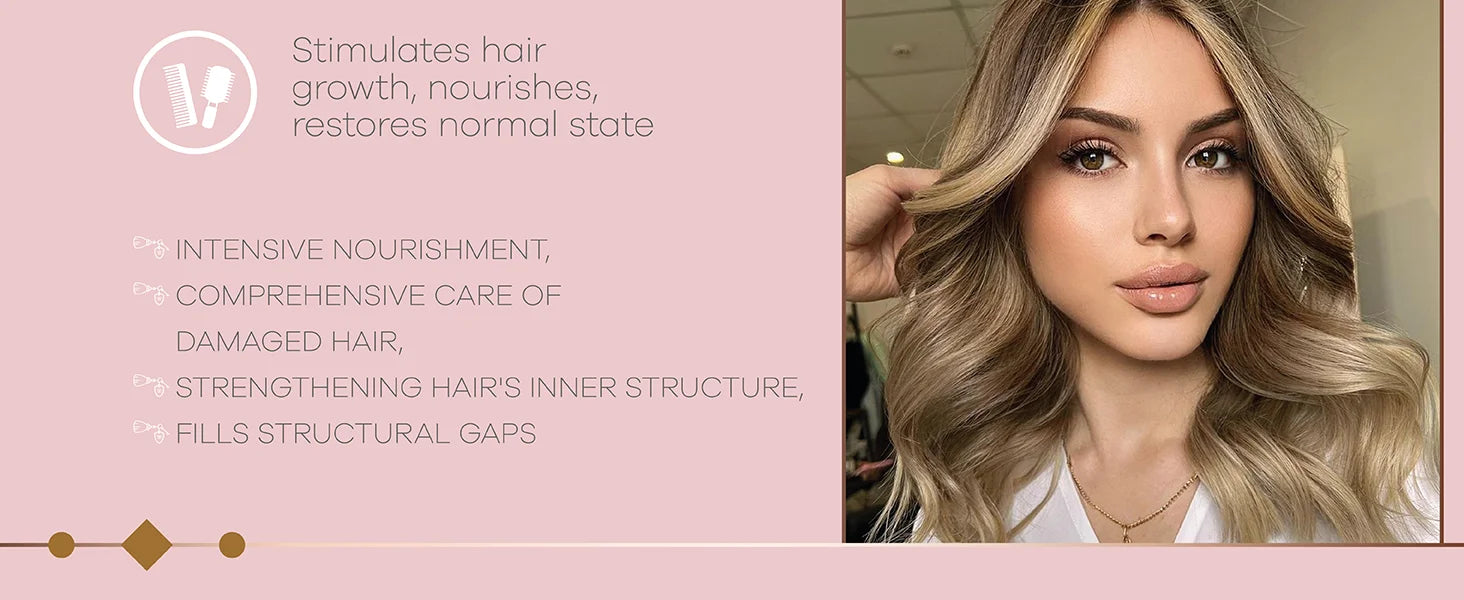 Gives hair vitality. Rich in glycine, cysteine , and essential amino acids. Restores damaged fibers, and contributes to the continuous growth of healthy hair.